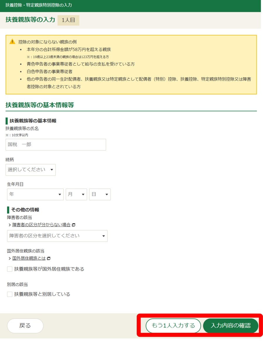 これで扶養控除・特定親族特別控除の入力は終了です。確定申告の入力の続きを行ってください。