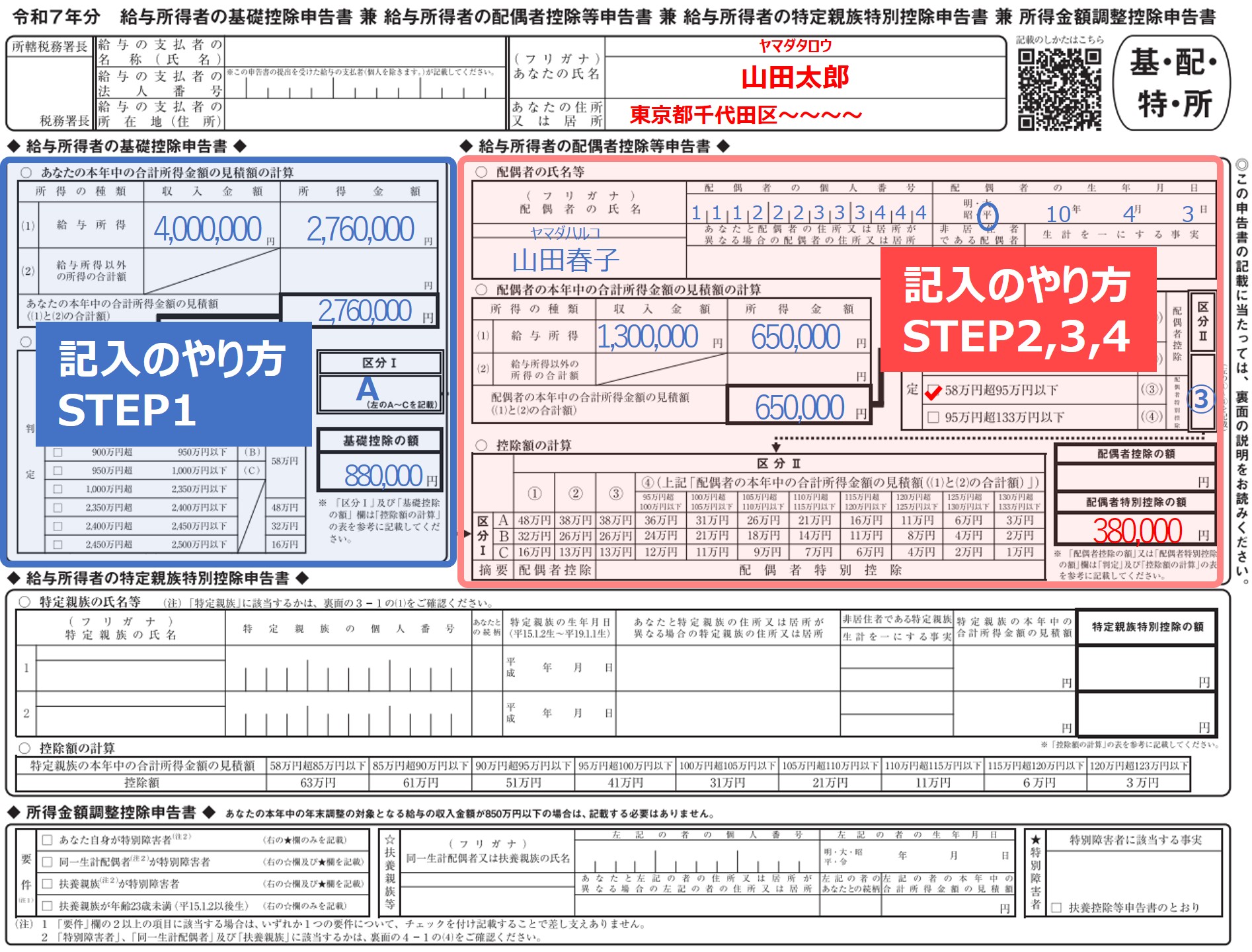 配偶者控除または配偶者特別控除の申請をするには給与所得者の基礎控除申告書 兼 配偶者控除等申告書 兼 所得金額調整控除申告書を提出しなければいけません。2025年度(令和7年)の記入例は以下に示したとおりです。